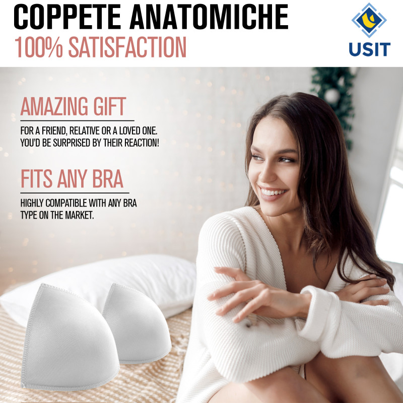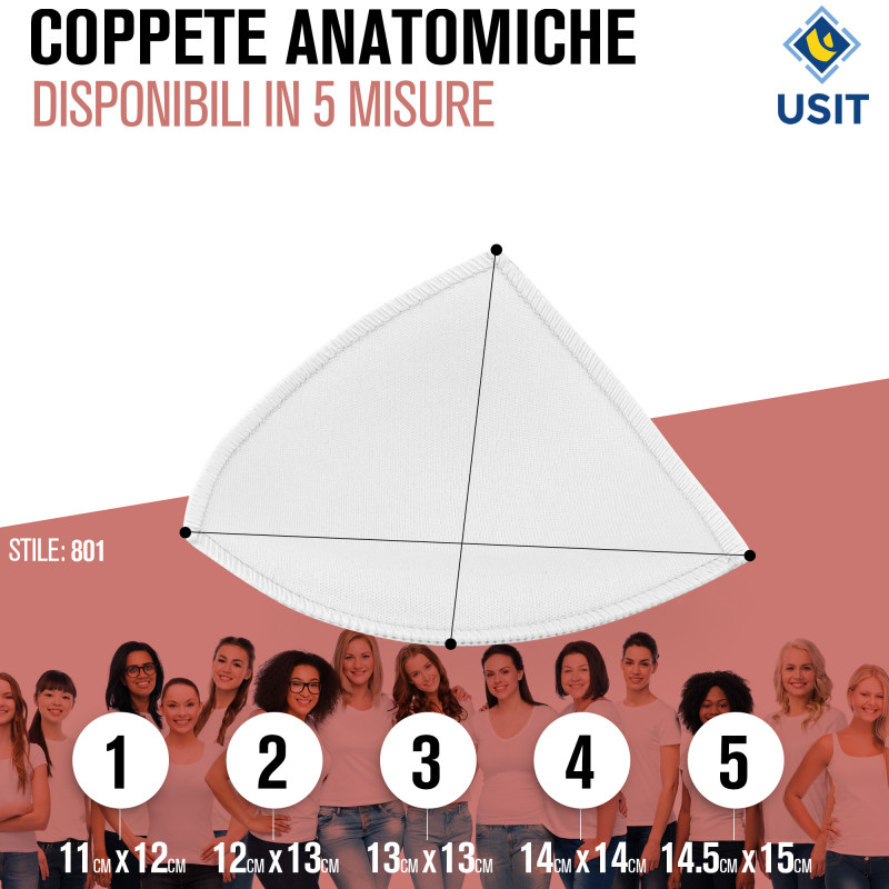 Coppette anatomiche con push up, estraibili e lavabili. Forma Bikini a triangolo, donano un effetto push up naturale al seno.