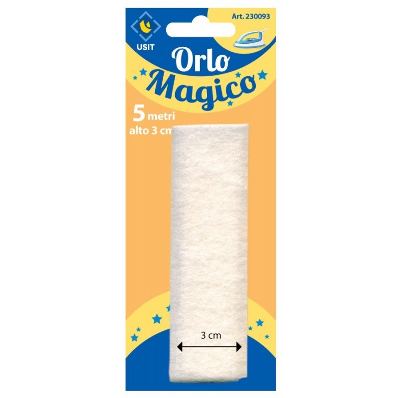 Adesivo termosaldante da 5 metri... l'orlo in un minuto. Orlo Magico è un sottile nastro di resina che si scioglie, diventando colla a caldo, con il calore del ferro da stiro. E' ideale per l'esecuzione di orli. Non altera la morbidezza dei tessuti e resiste a qualsiasi lavaggio.