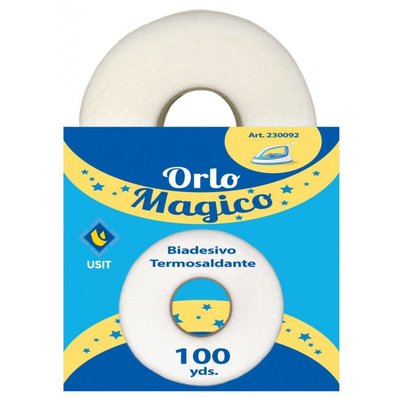 Adesivo termosaldante da 100 yds... l'orlo in un minuto. Orlo Magico è un sottile nastro di resina che si scioglie, diventando colla a caldo, con il calore del ferro da stiro. E' ideale per l'esecuzione di orli. Non altera la morbidezza dei tessuti e resiste a qualsiasi lavaggio.