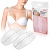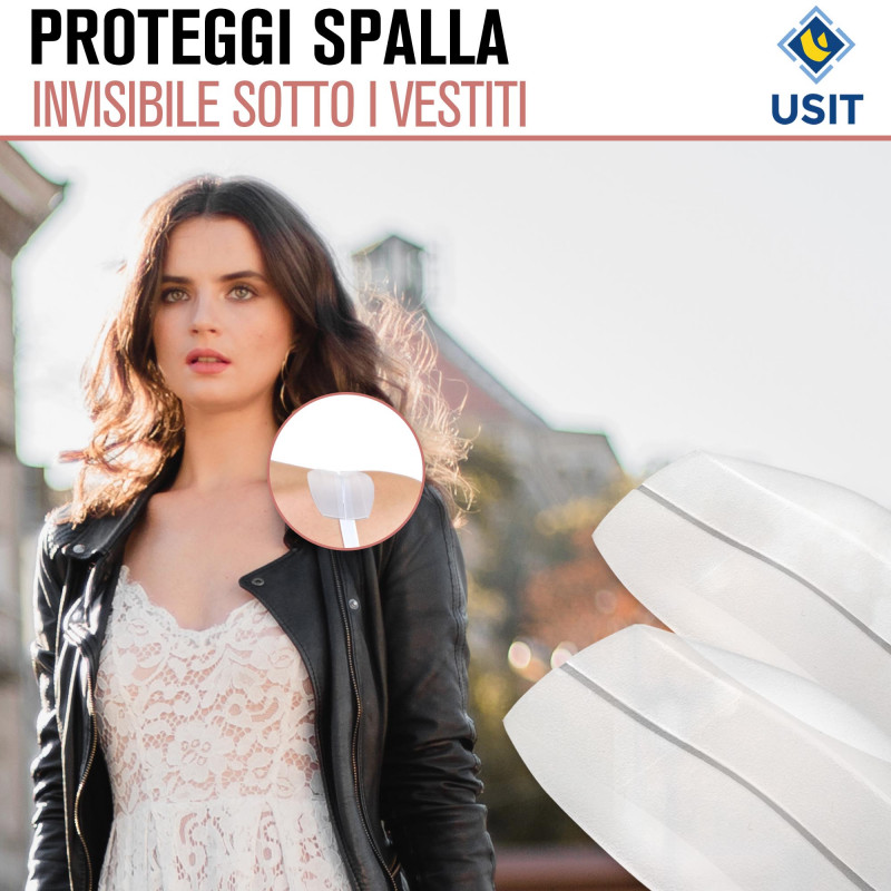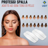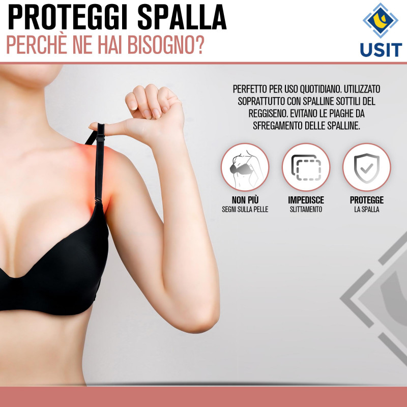 Morbide protezioni per spalla in silicone anallergico, evitano lo sfregamento della spallina sulla pelle. Disponibili nei colori : Bianco-Nero-Nudo. Scatole da 12 blister.