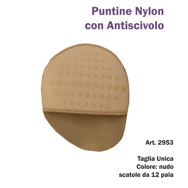 Puntine in nylon in taglia unica con plantare antiscivolo. Ideali da indossare con scarpe aperte sul tallone (tipo sabot). Scatole da 12 paia.